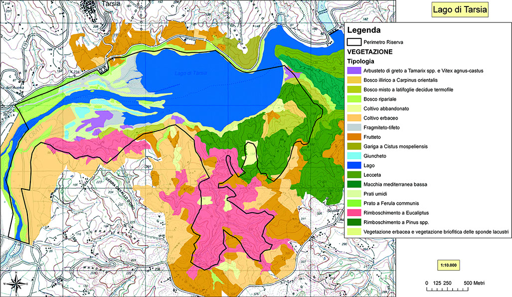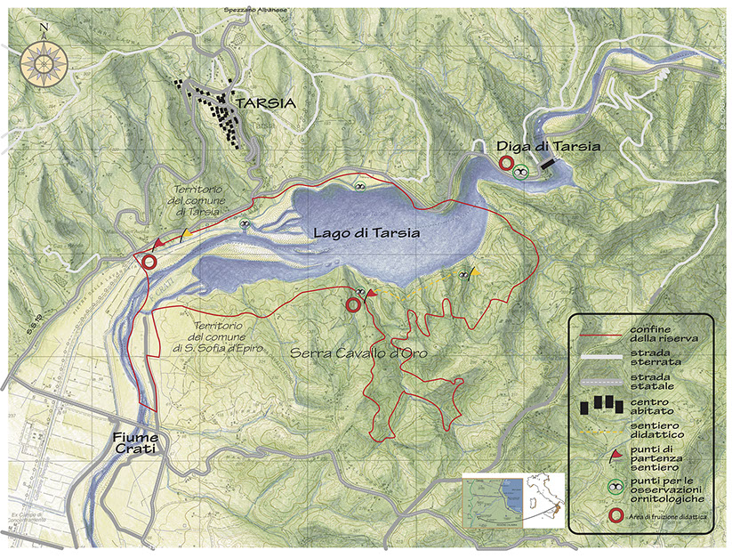 Lake Tarsia, a lake basin upstream of the Strette di Tarsia dam, falling within the territory of the municipalities of Tarsia and S. Sofia d'Epiro (Cs), represents an area of considerable naturalistic interest due to the existence of numerous ecosystems of value and for the great variety of plant and animal species.