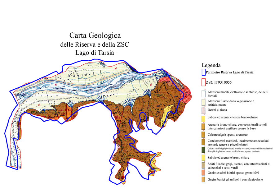 Alle strette di Tarsia, nell’area oggi occupata dal lago, affiorano le rocce metamorfiche del substrato (filladi, gneiss, ofioliti fra le quali rocce verdi, metabasalti e pillow-lavas e diaspri, quest'ultimi ben evidenti sulla parete di destra all'incrocio con la strada per Terranova da Sibari), ricoperte superiormente da sedimenti arenaceo - argillosi. Superiormente questa emergenza termina con uno spianamento che altro non é che un’antica spiaggia come si deduce dalla presenza, segnalata in più punti, di fori nella roccia lasciati da lamellibranchi del tipo Lithodomus lithofagus.