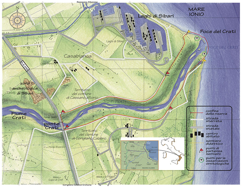 The “Foce del Fiume Crati” Nature Regional reserve, located in the province of Cosenza, being part of the towns of Corigliano-Rossano and Cassano allo Ionio (between the hamlets of Thurio and Laghi di Sibari), was founded by the Calabria Region in 1990 (Regional Law n. 52 of 5th may 1990), following the proposal of the Italian association, “Amici della Terra”, which focuses on the environmental protection.
